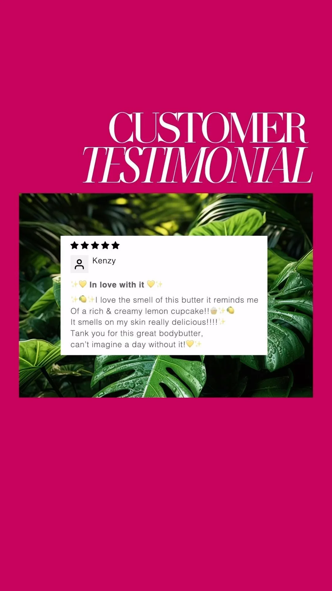 “This body butter is amazinggggg! From the smell to the way it leaves your skin feeling. I love using it right out the shower. It makes my skin glisten and keeps it nice and hydrated. The smell is everything!!!! Makes me smile every time I open the jar!”